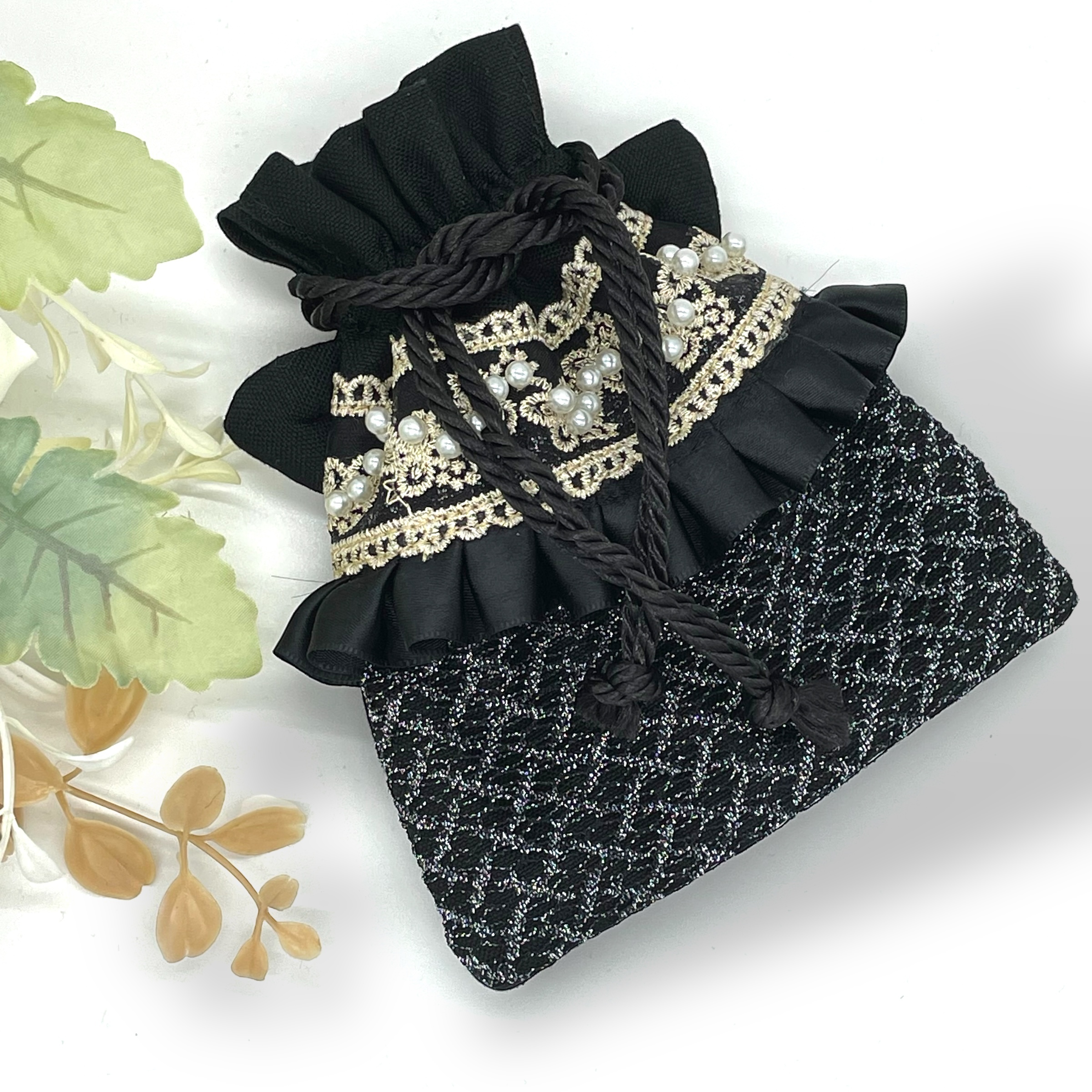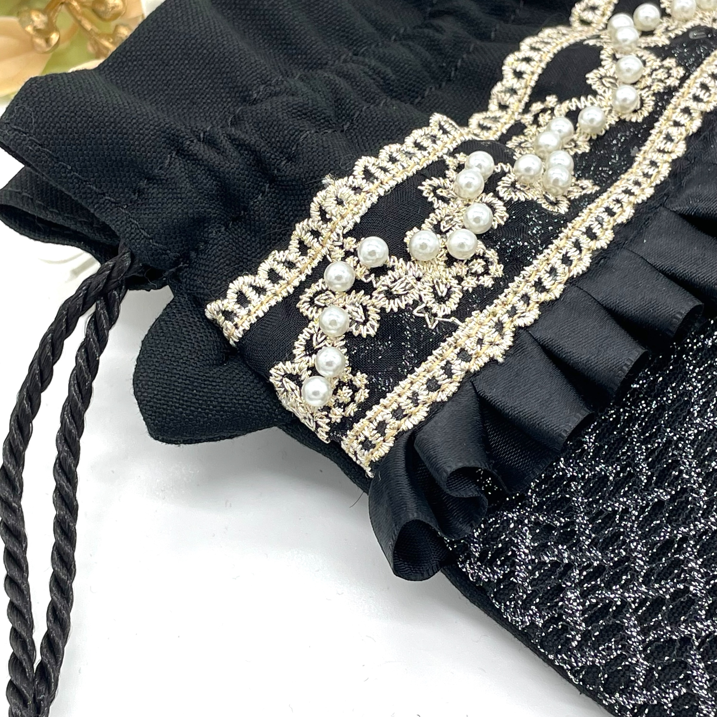 黒の帆布にレースを重ね、フリルやブレードで華やかに装飾しています。