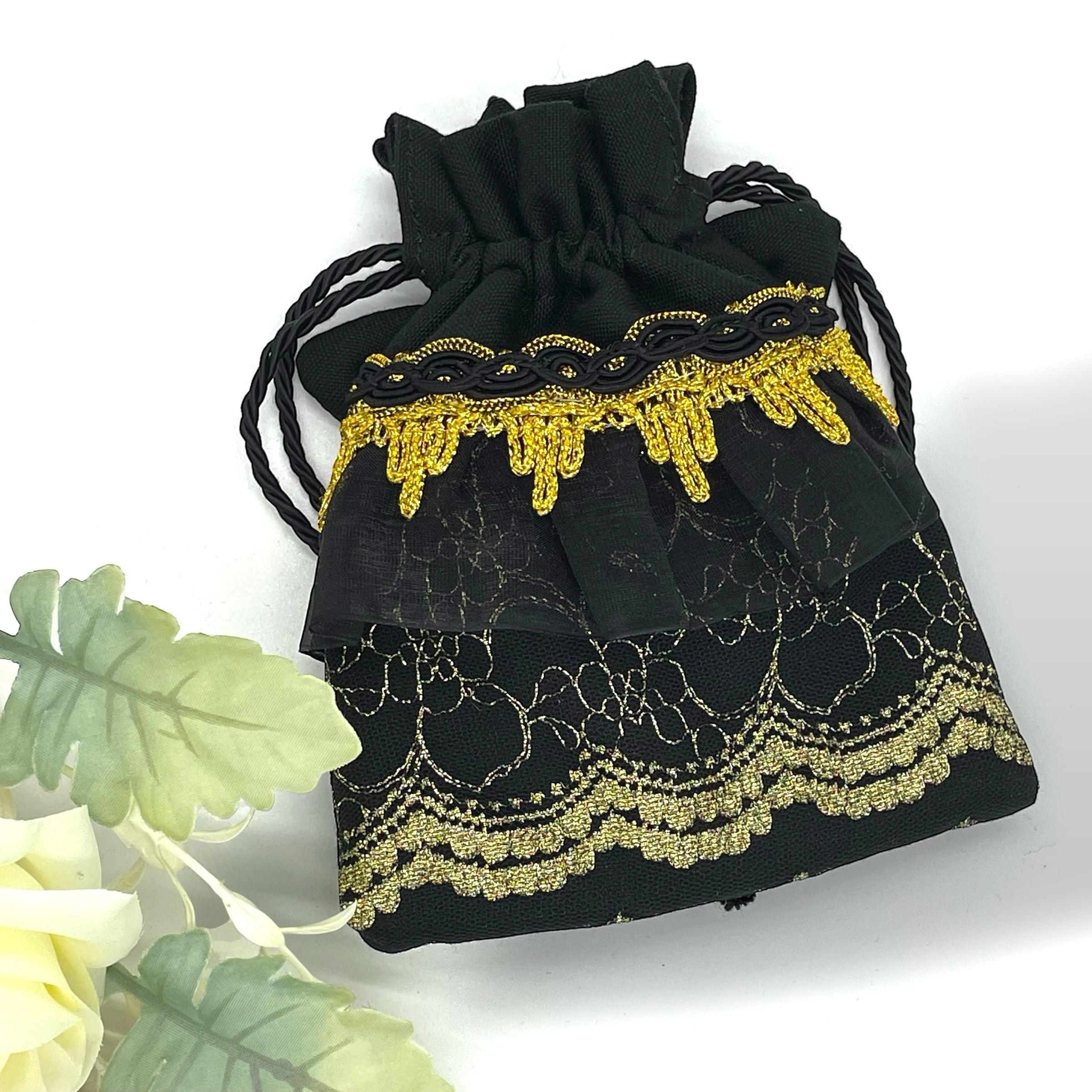 黒の帆布にレースを重ね、フリルやブレードで華やかに装飾しています。