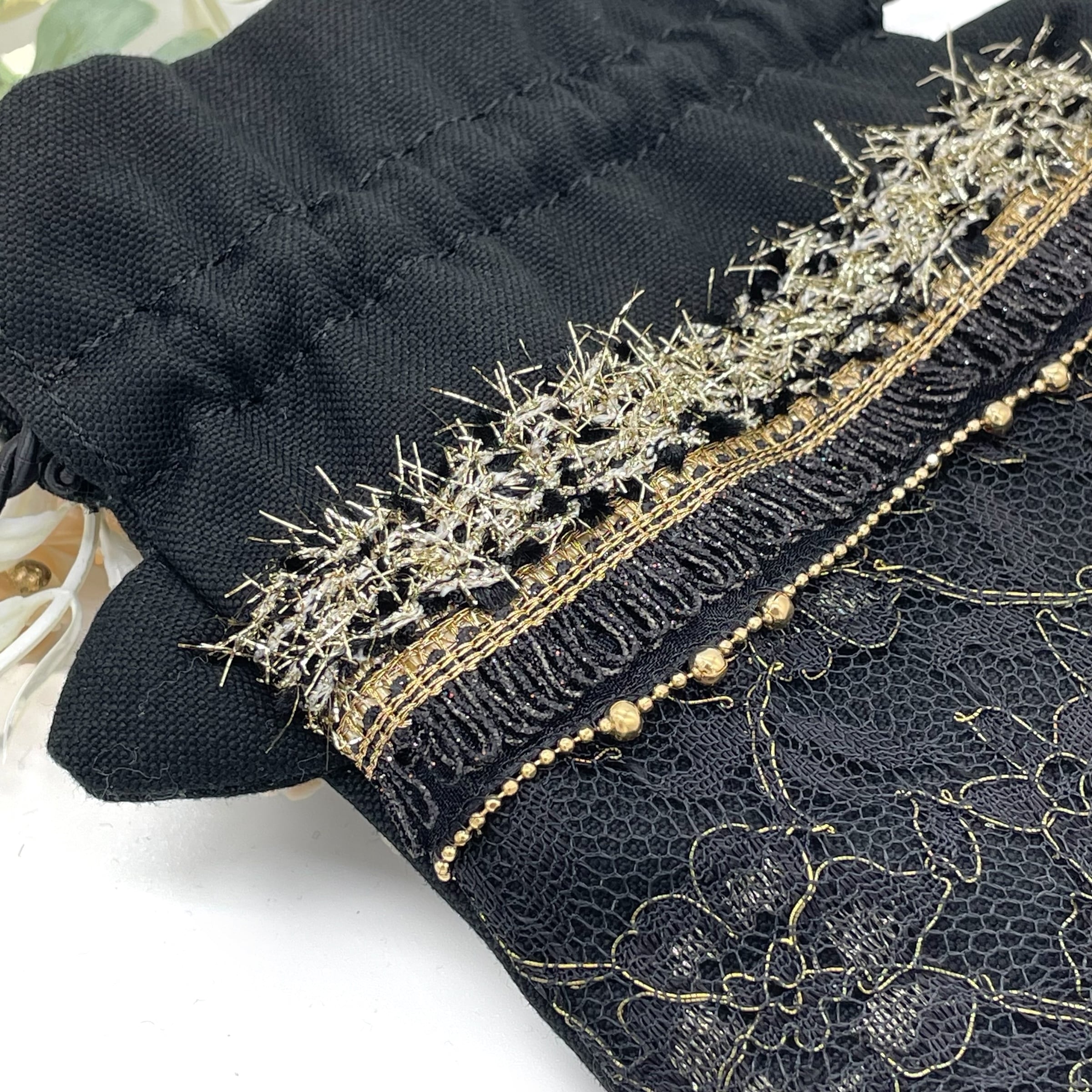 黒の帆布にレースを重ね、フリルやブレードで華やかに装飾しています。