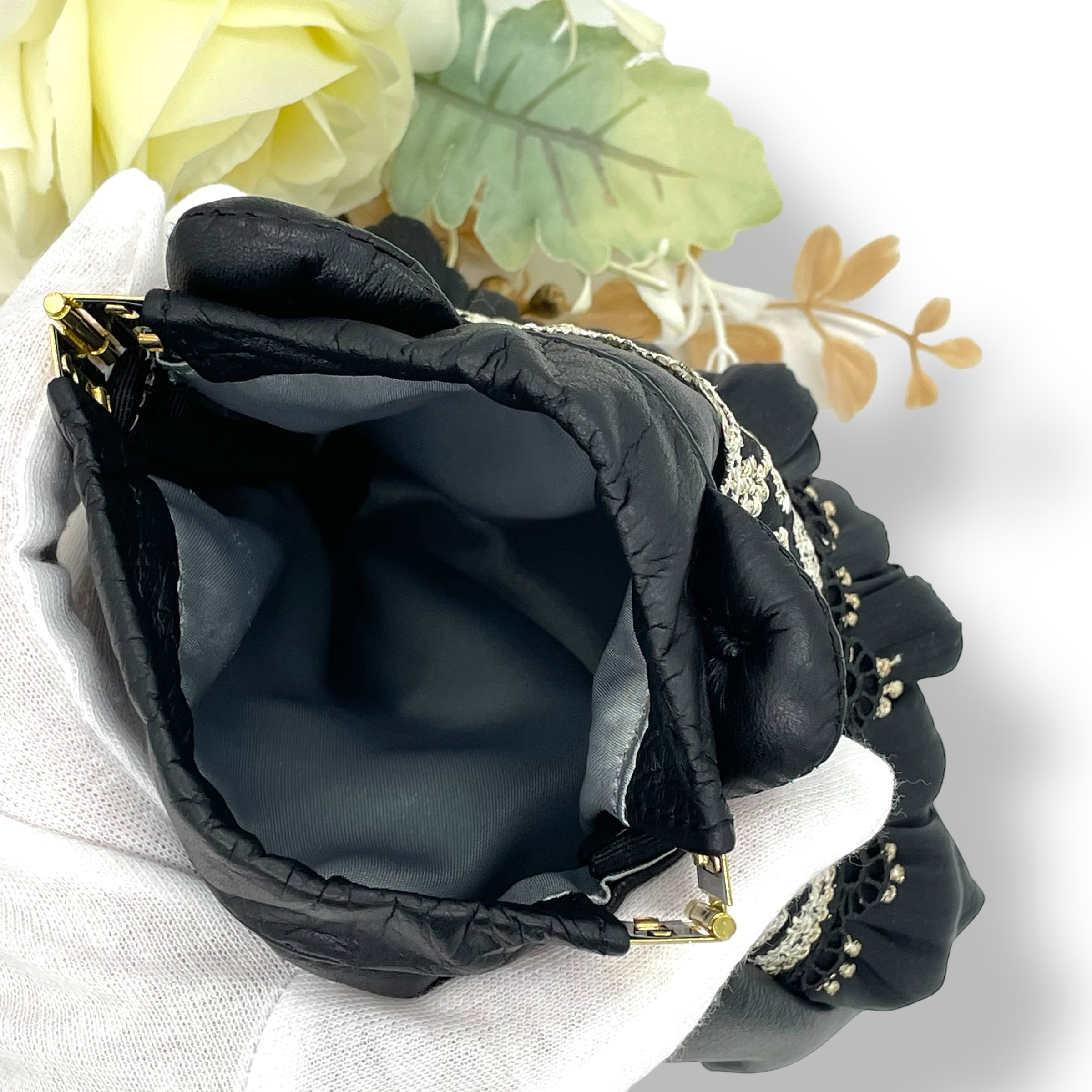 裏地は、中が見やすいように明るいグレーのサテン生地を使用。